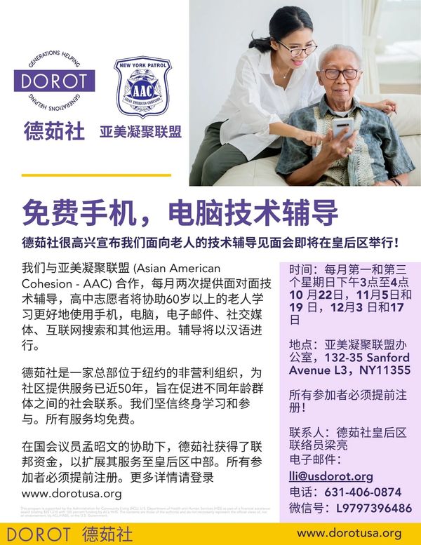 AAC和德茹社青少年文工和孟昭文选区内的免费教电脑、手机技术的辅导互动活动,欢迎60岁以上的耆老来参加。时间将在 11/5,11/19,12/3 和12/17 日AAC 办公室在132-35 L3 Flushing (在缅街和大学点之间).