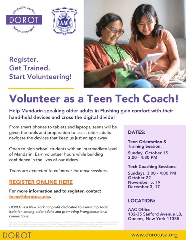 AAC and DOROT's youth cultural workers, in collaboration with Congresswoman Grace Meng, are offering complimentary tutoring sessions and engaging activities aimed at instructing constituents in computer and mobile phone proficiency. These inclusive sessions extend a warm welcome to individuals aged 60 and above. Mark your calendars for the following dates: 11/5, 11/19, 12/3, and 12/17. You can join us at the AAC office located at 132-35 L3 Flushing, situated between Main Street and University Point.